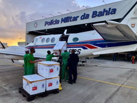 Aeronaves do Grupamento Aéreo (Graer) da Polícia Militar da Bahia e da Casa Militar do Governador (CMG) iniciaram, às 7h desta quarta-feira (3), a 6ª fase da Operação de Distribuição de Vacinas contra o novo coronavírus. Quarenta e duas cidades da Região Metropolitana de Salvador (RMS) e do interior receberão 88.130 doses do imunizante do Butantan.