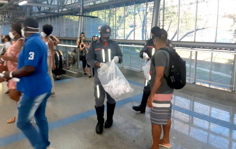 Uma equipe do Corpo de Bombeiros Militar da Bahia (CBMBA) distribuiu 4 mil máscaras reutilizáveis de tecido na estação Acesso Norte do metrô, nesta ultima terça-feira (22). A ação, coordenada pela força-tarefa coordenada pelas secretarias do Planejamento (Seplan), Desenvolvimento Econômico (SDE) e Desenvolvimento Rural (SDR), teve como objetivo ampliar a proteção da população, além de alertar sobre a importância da prevenção contra o coronavírus. As máscaras foram adquiridas pelo Governo do Estado junto a 603 associações, cooperativas e empresas habilitadas para a produção de mais de 12 milhões de unidades.