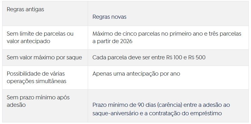 As novas regras que limitam a antecipação do saque-aniversário do Fundo de Garantia do Tempo de Serviço (FGTS) entram em vigor. A mudança, aprovada pelo Conselho Curador do FGTS e implementada pela Caixa Econômica Federal, altera o funcionamento dos empréstimos que permitem ao trabalhador antecipar valores futuros do fundo.