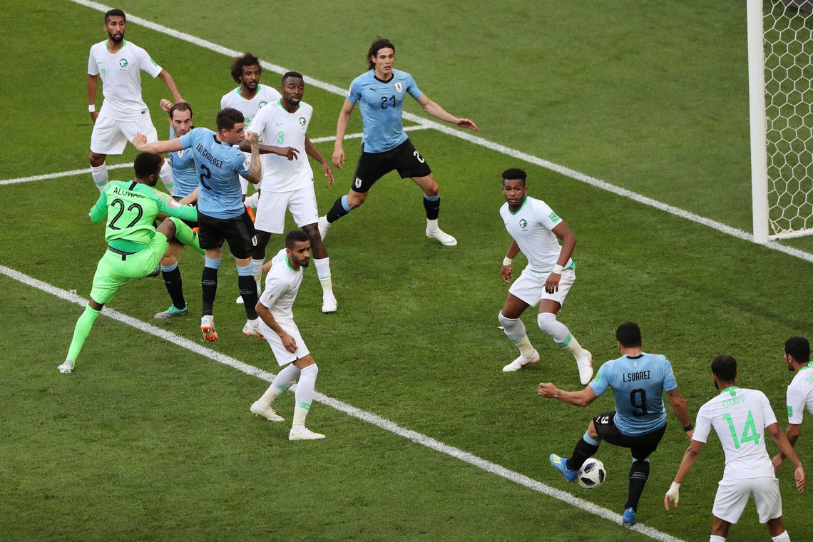 A vitória garantia a classificação dos uruguaios e a esperança de gols estava nos pés do artilheiro Suárez. E, aos 22 minutos do primeiro tempo, finalmente desencantou. Na cobrança de escanteio, o goleiro árabe Al-Owais saiu errado e socou o vazio. A bola sobrou para o atacante uruguaio, que venceu a disputa de espaço com o zagueiro e tocou para o fundo do gol.